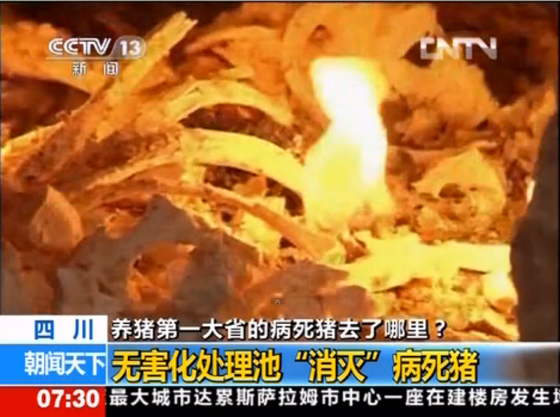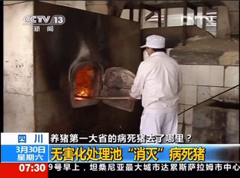 在我公司的無害化處理焚燒間,央視記者現(xiàn)場查看了處理病死豬的焚燒爐工作運(yùn)行情況,對病死豬的來源、無害化處理程序、記錄、費(fèi)用的解決等問題作了詳細(xì)了解,并在我公司品管部調(diào)看了省商務(wù)廳建立的食品安全可追溯系統(tǒng)中對我公司病害畜禽無害化處理情況的監(jiān)控錄像。30日,中央電視臺新聞?lì)l道朝聞天下欄目在“四川:養(yǎng)豬第一大省的病死豬去了哪里?”的節(jié)目中作了報(bào)道。