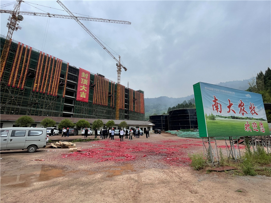 新建封頂?shù)哪洗筠r(nóng)牧公司是四川省遂寧市南大食品有限公司全額出資的子公司。投資1.5億元,種豬場(chǎng)采用立體養(yǎng)殖樓房設(shè)計(jì),層高5米,主樓8層樓高,建筑面積40000余平米。項(xiàng)目占地80畝,流轉(zhuǎn)土地2000畝。建成后年出欄生豬達(dá)12萬頭。